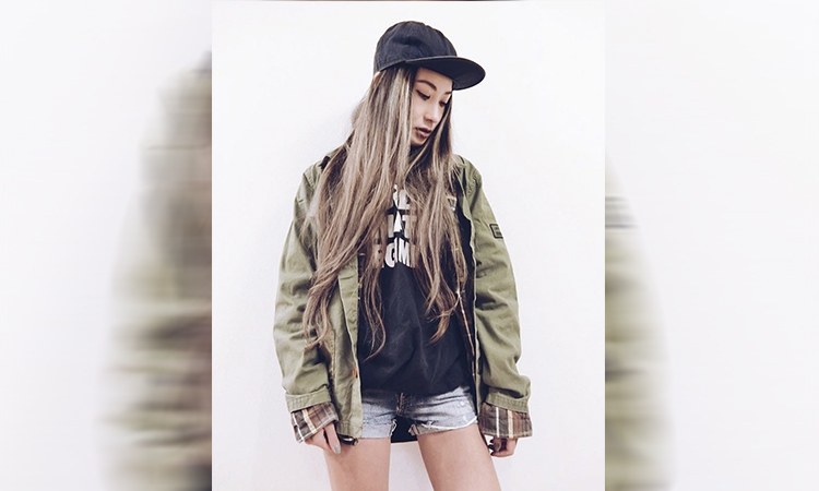 155cmと小柄ながらメンズのMサイズのシャツジャケットをちょっと大きめに着こなしている。ロングヘアーにブラックのキャップ、マイクロショートなデニムパンツでインナーがブラックのメッセージTeeが90’s Black Music のFemmale Styleを感じさせている。