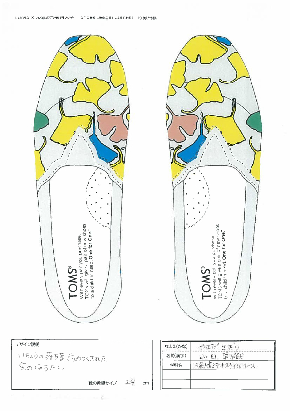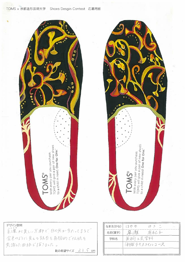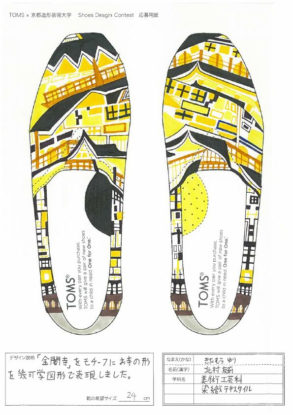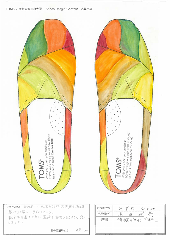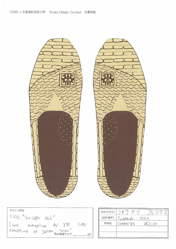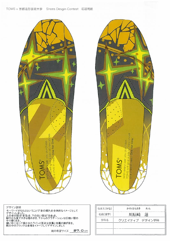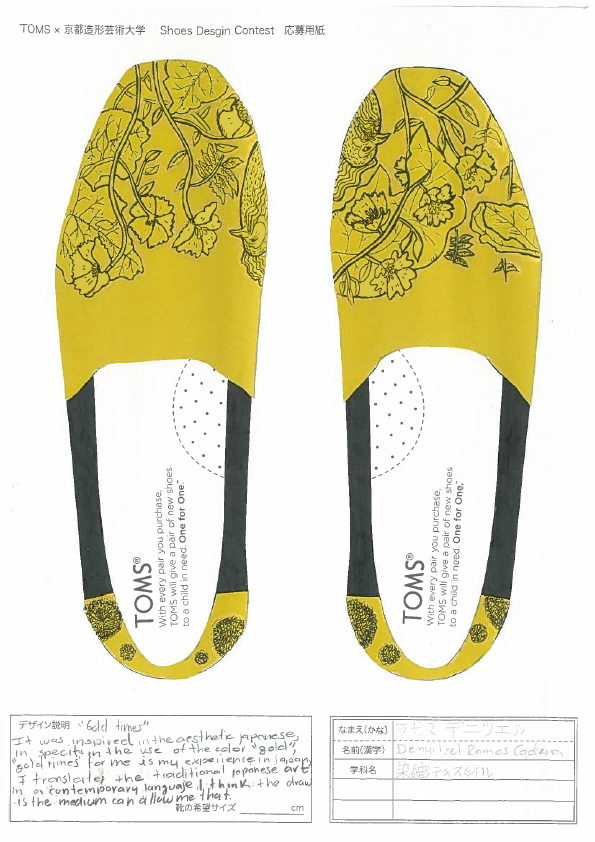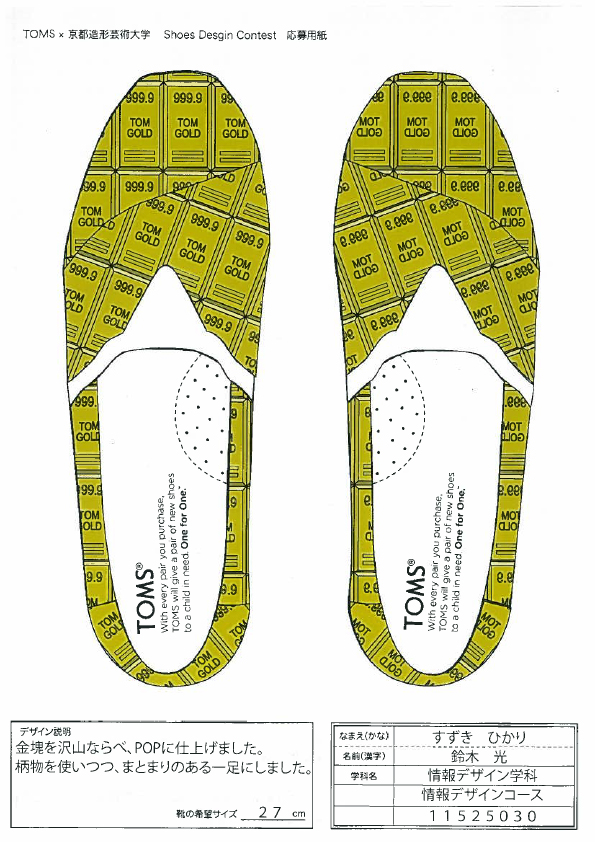 TOMSと京都造形大学によるShoes Design Contest 2015が今年も開催。キーワード “ GOLD ”によって提出された作品は全66点。現在、京都造形大学にて展示中。26日まで学内展示と学内投票によって第二次審査参加者10名を選出する。