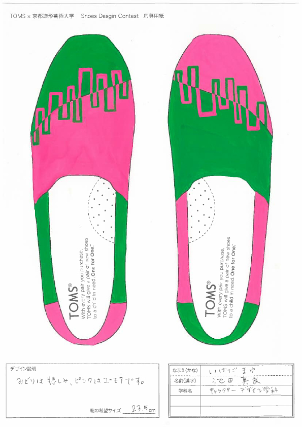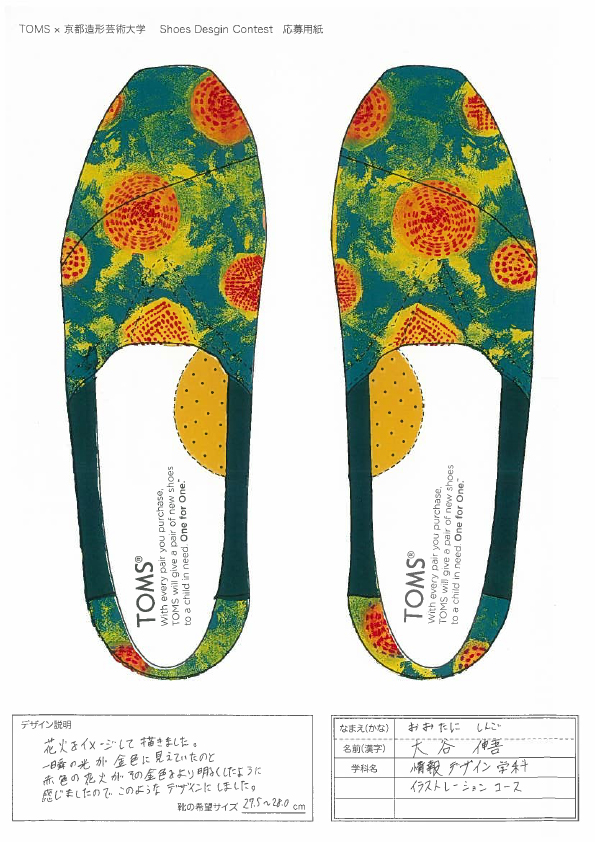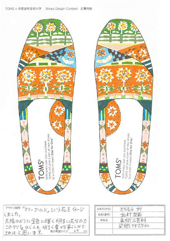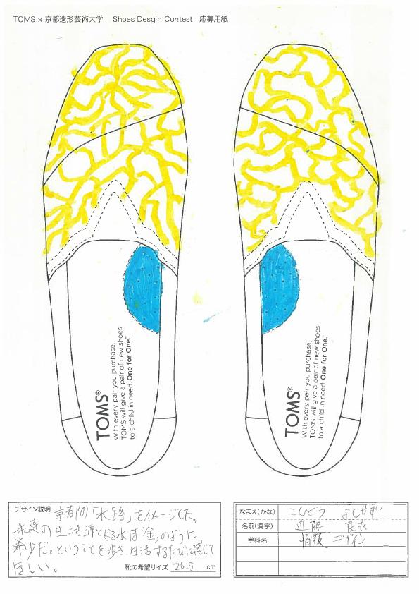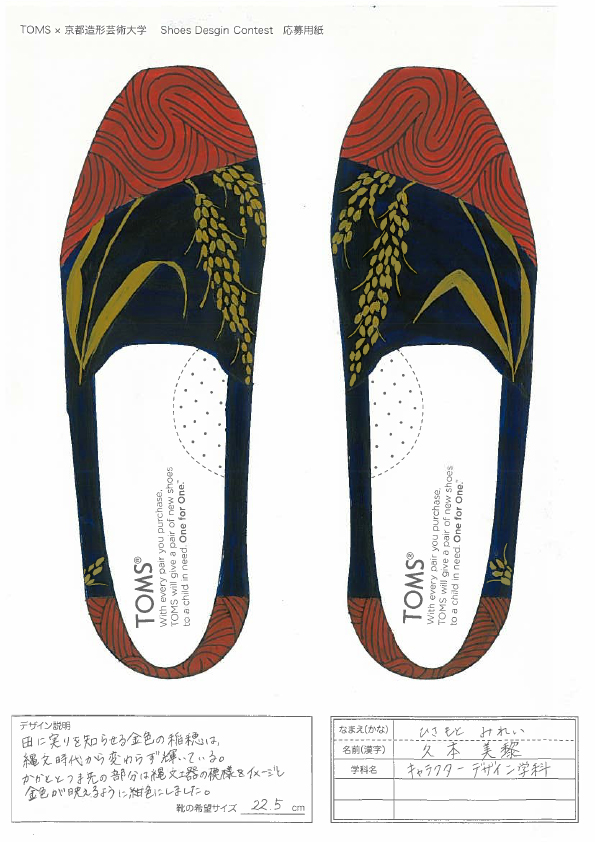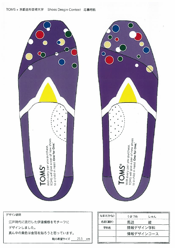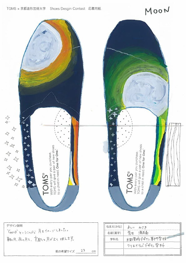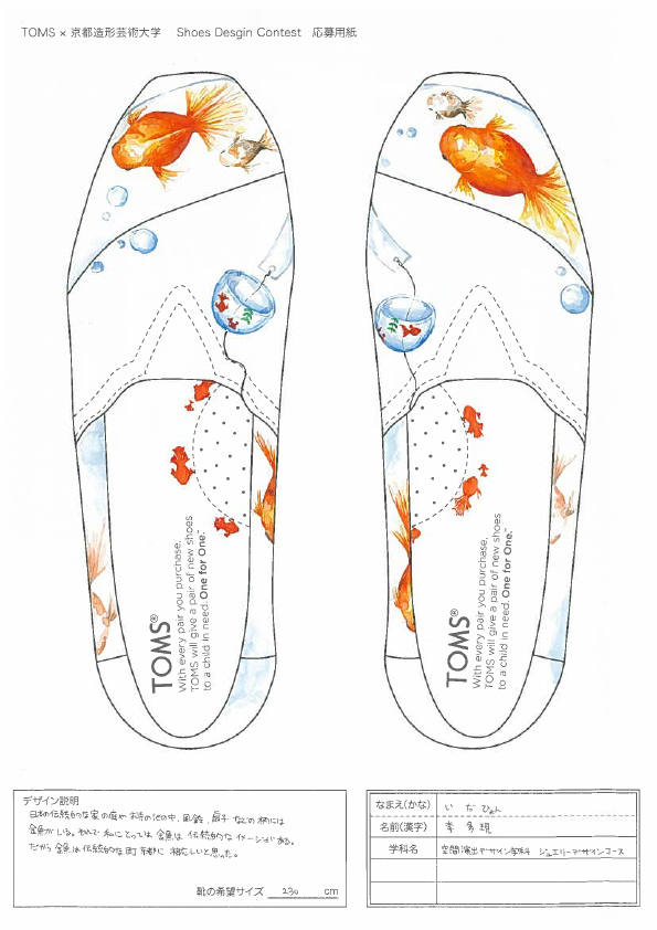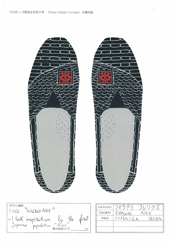 TOMSと京都造形大学によるShoes Design Contest 2015が今年も開催。キーワード “ GOLD ”によって提出された作品は全66点。現在、京都造形大学にて展示中。26日まで学内展示と学内投票によって第二次審査参加者10名を選出する。