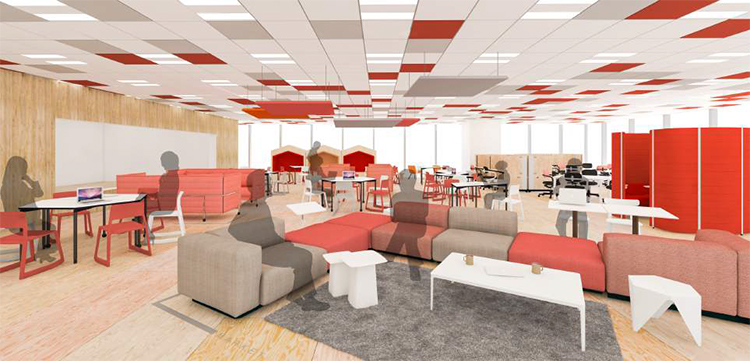 市場のように情報や人が行き交う交差点としての機能を持つスペース。周囲が見渡せるようにモジュラーシステムのソファを配置。休憩時にアイデアやインスピレーションに結びつくきっかけや、掲示機能による告知の場としても利用可能。残響音を軽減するKvadrat社のSoft Cellsも設置されている。