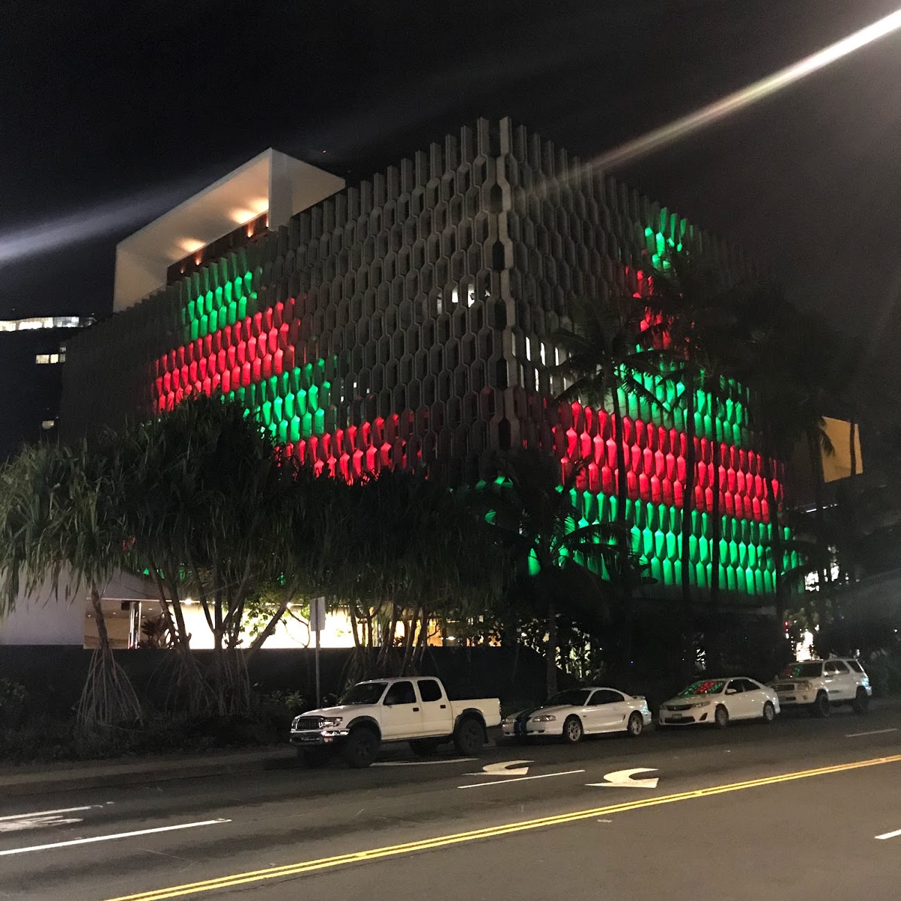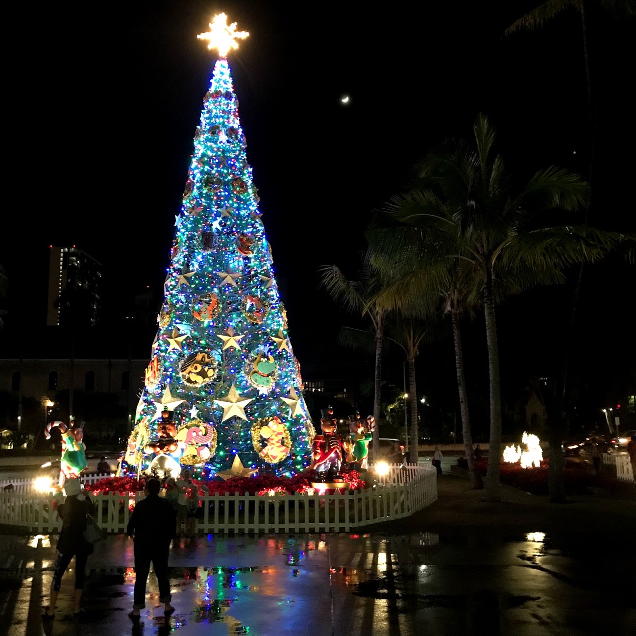 クリスマスシーズンのこの時期、HONOLULU CITY LIGHTSというエキシビションをこのホールを中心に開催されていて、キラキラとクリスマスデコレーションが輝いていた。