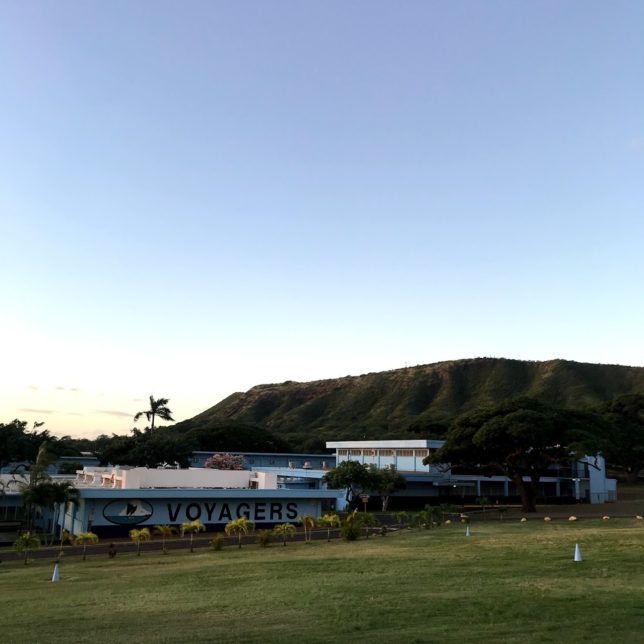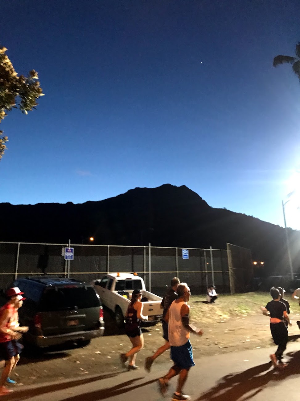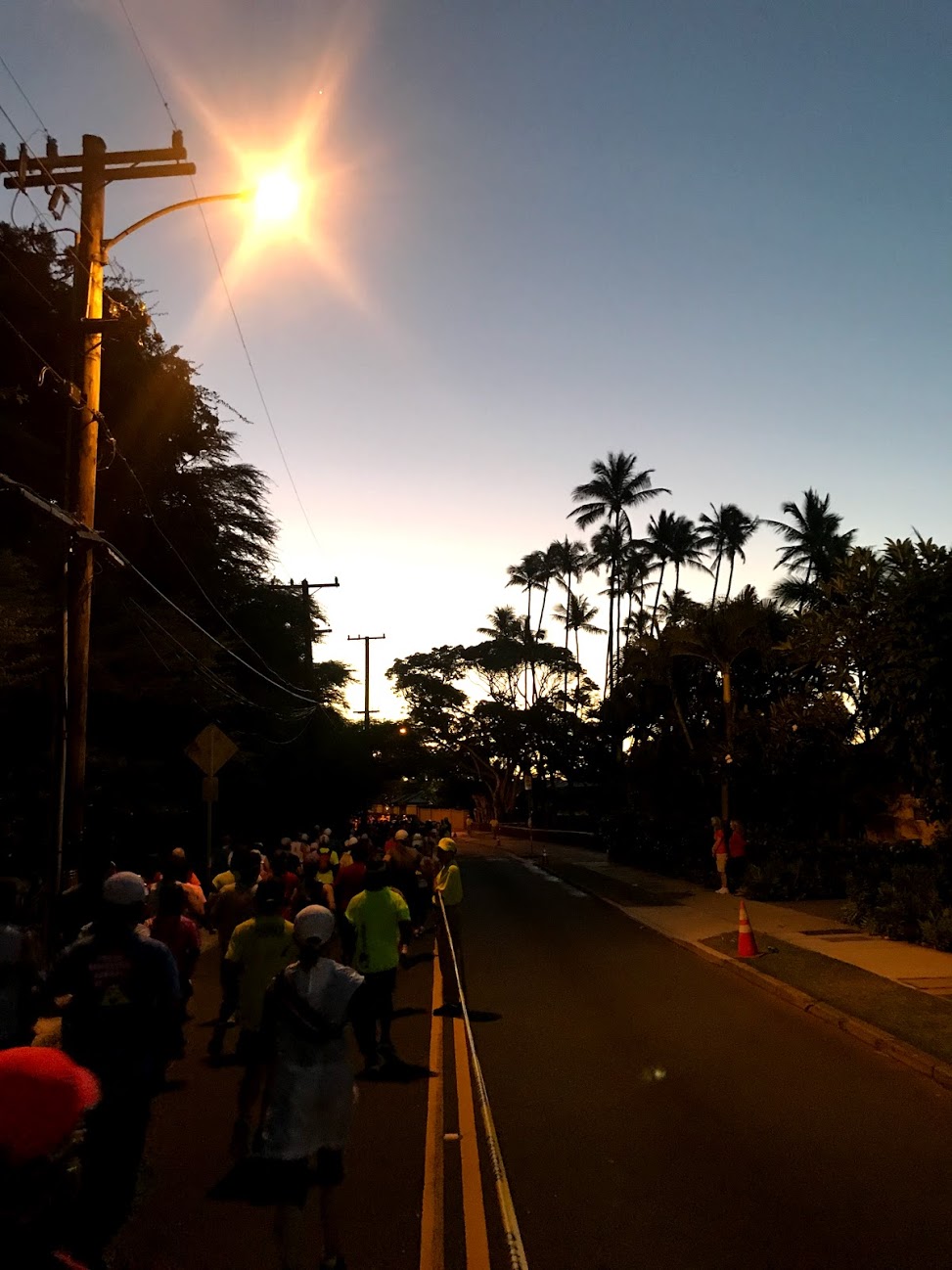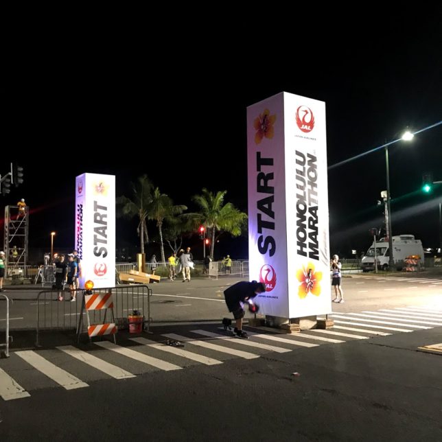 大抵の人は、単身で参加する人が少なくツアー会社がチャーターしたバスでホテルから会場に向かいます。大会側が用意するピストンバスもあるらしいけど、ウォームアップがてら歩きたかったしこんな時間のワイキキのストリートも見てみたかった。