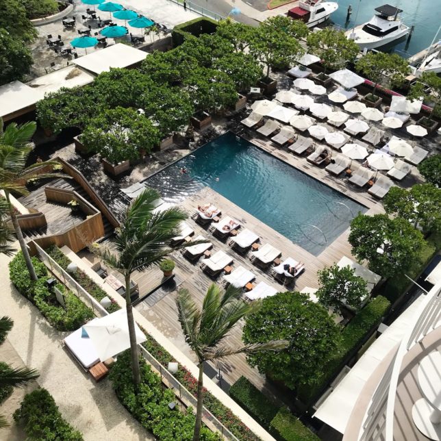 部屋から見下ろすと、ホテルのプールとヨットハーバー、そしてビーチ。