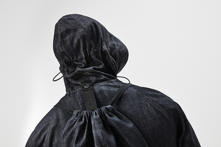 ボンバージャケットの新解釈。袖は人間工学に基づきビックサイズを強調、背中にはバックパックが配置され、ストラップはジャケットを脱いだ時にも背中にかけられる機能的なデザインとなっている。