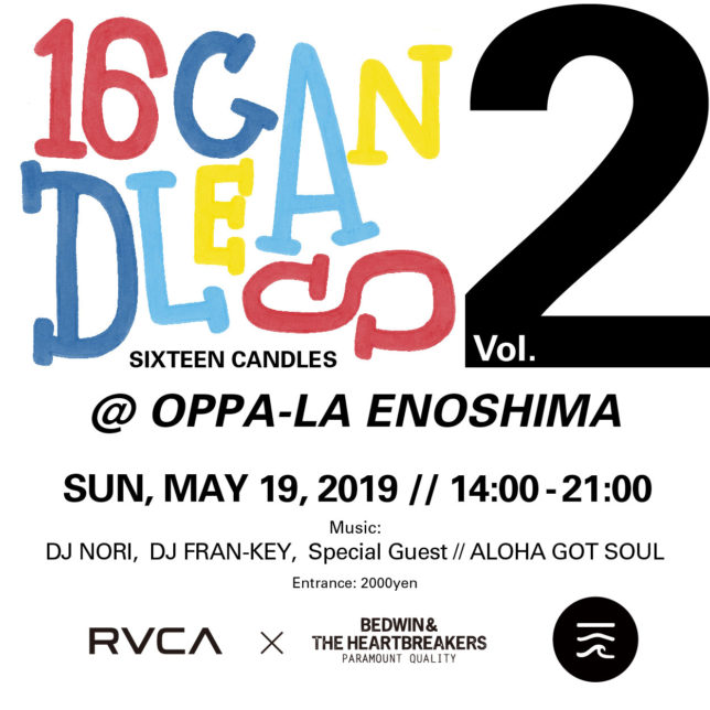 RVCAとBEDWIN & THE HEARTBREAKERSによる不定期開催のパーティー “SIXTEEN CANDLES”が第2回目は5月19日の日曜日に湘南・江ノ島のオッパーラで14:00-21:00までのサンデーアフタヌーンパーティーで開催です。