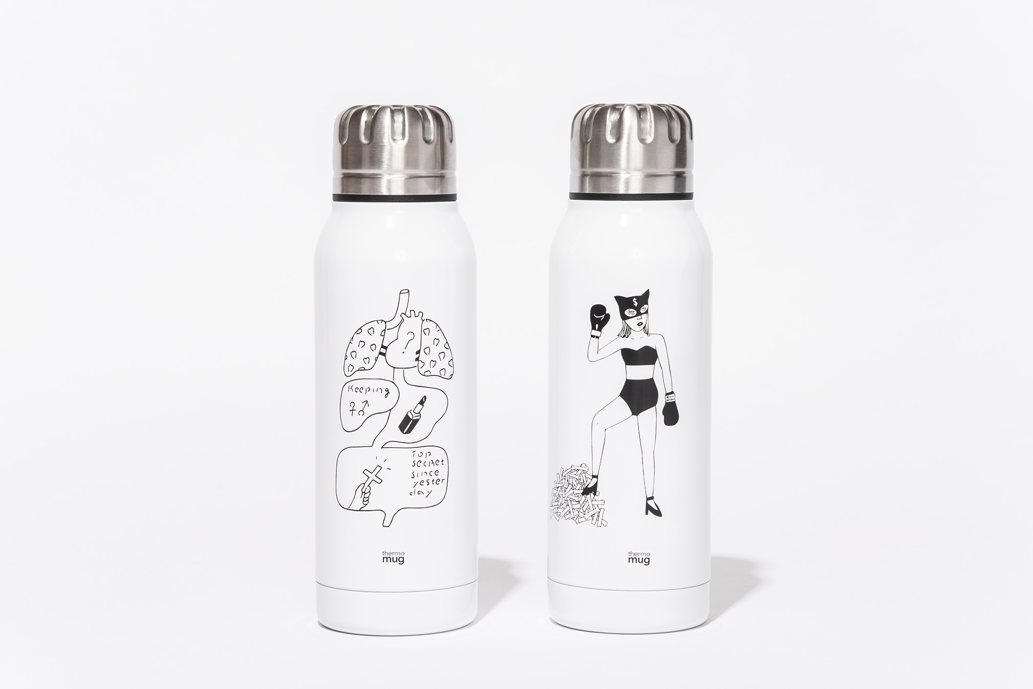 thermo mug × とんだ林蘭のコラボレーションモデル「TBR Umbrella Bottle」が発売。とんだ林蘭ならではの猟奇的なイラストが描き下ろされている。可愛らしいモチーフが各内臓に散りばめられたOrgant、猫のマスクを被った女の子が骨を踏みつけるCat fightの2パターンで展開。カラーはベーシックなWHITE , SILVER , BLACK の三色展開。